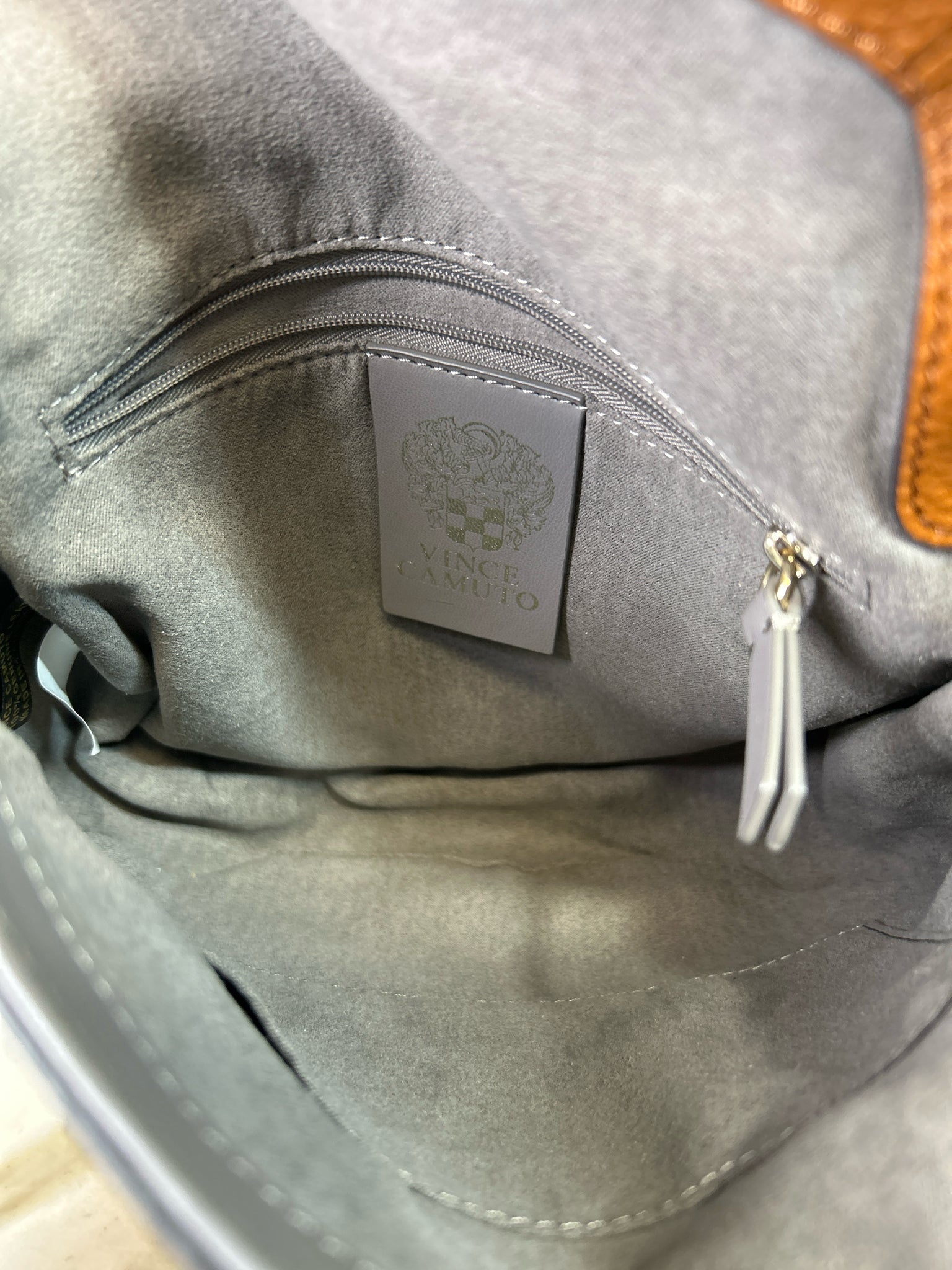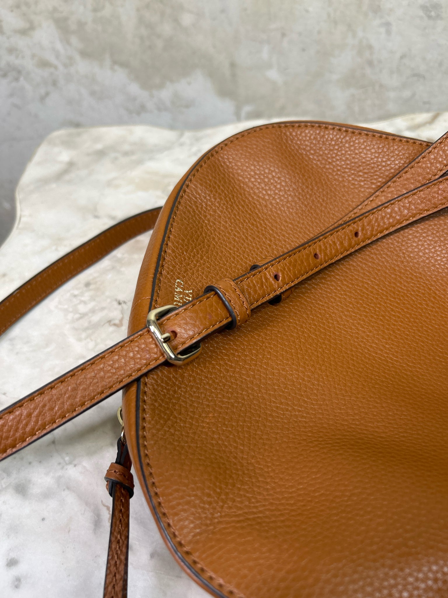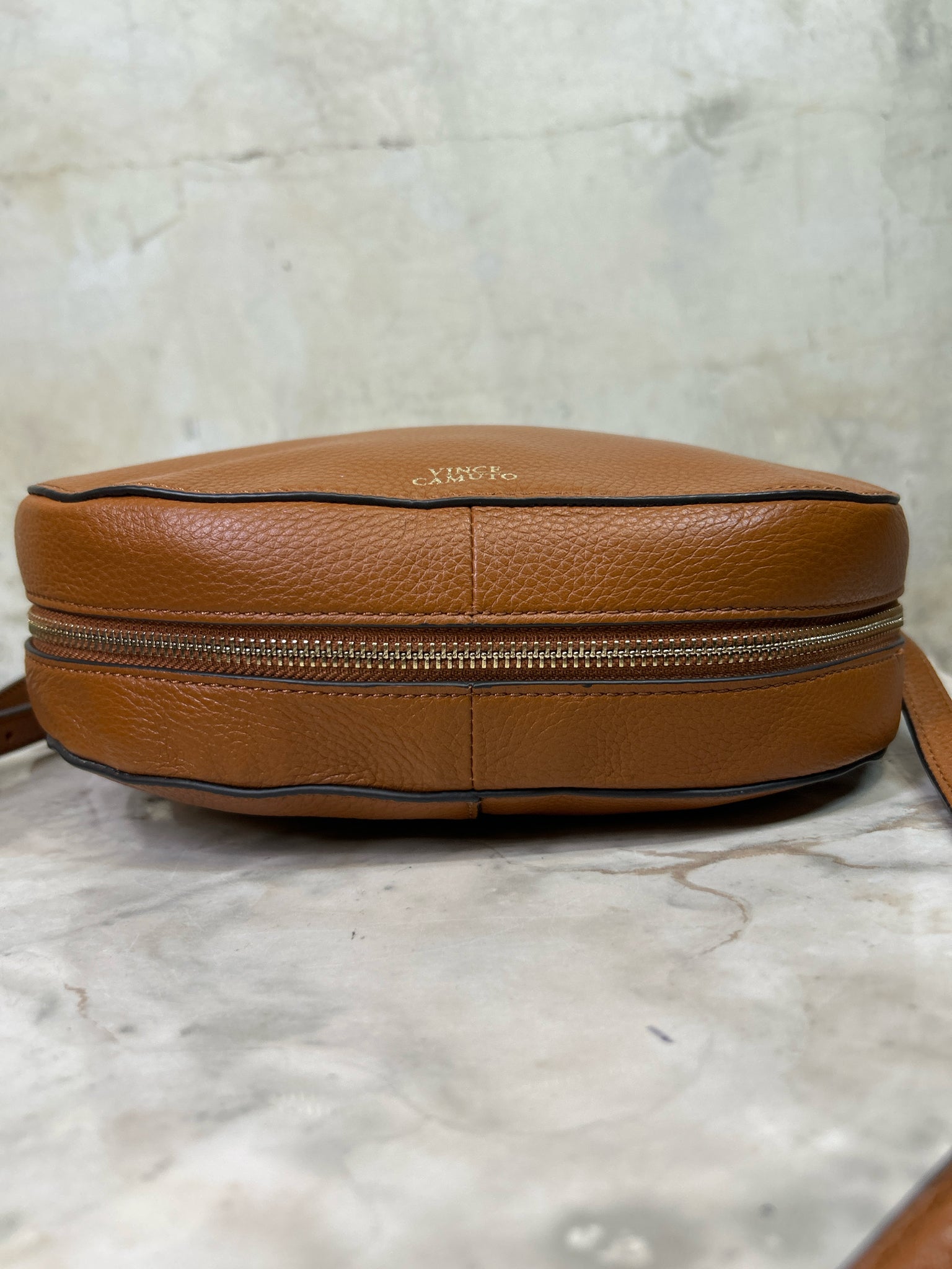 VINCE CAMUTO Tan Kenzy Crossbody PEBBLED LEATHER Purse - Tan is backordered and will ship as soon as it is back in stock.