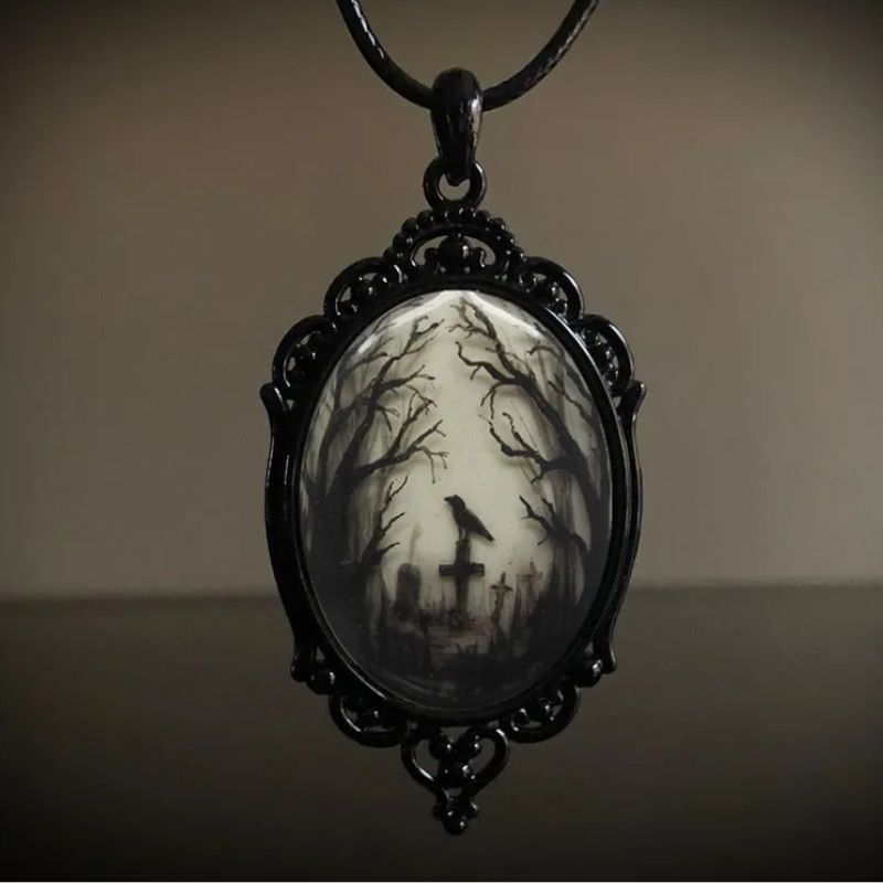 Halloween Crow in a Graveyard Necklace