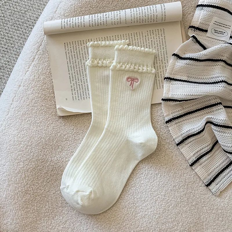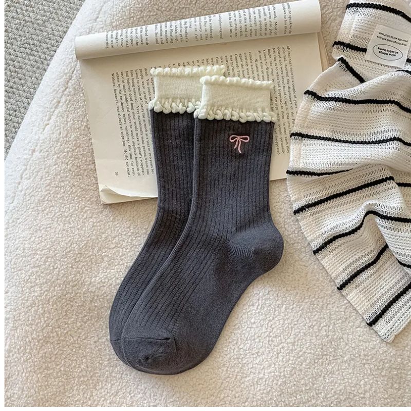 Ribbed Socks with Top Ruffle & Pink Embroidered Bow - Gray is backordered and will ship as soon as it is back in stock.